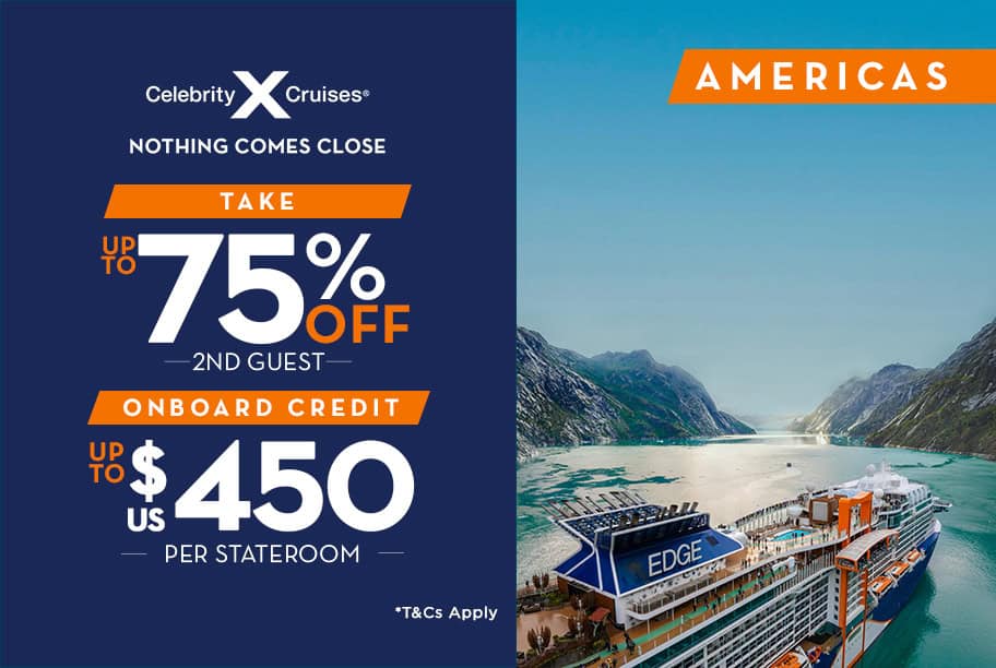 For a limited time on select Americas Celebrity cruises save up to 75% off 2nd Guest + up to $450 onboard credit!