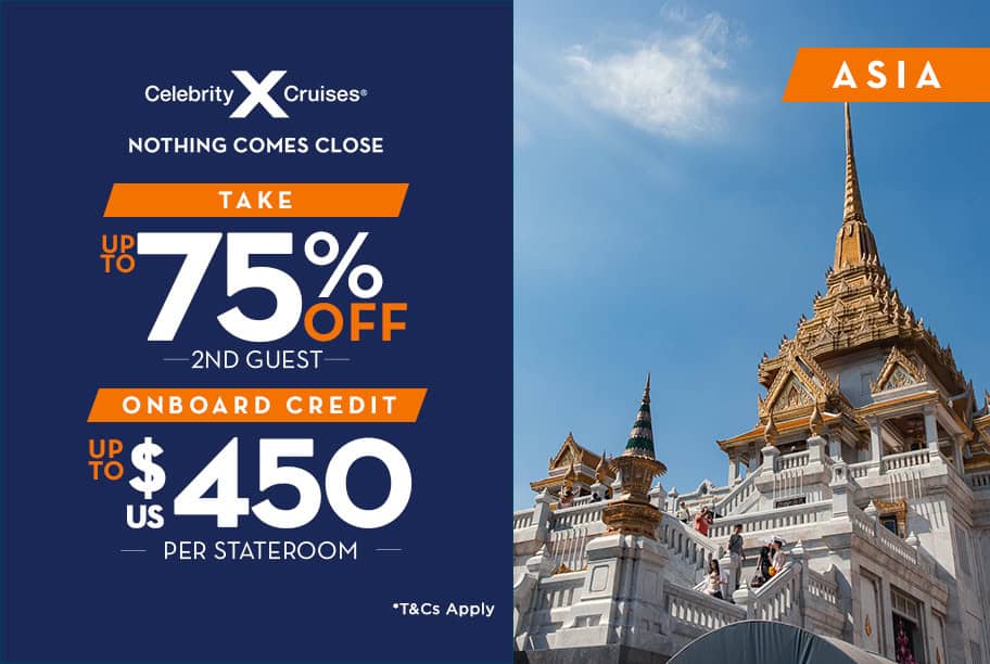 For a limited time on select Asia Celebrity cruises save up to 75% off 2nd Guest + up to US$450 onboard credit!