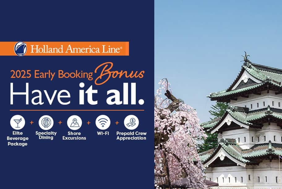 Book your 2026 or 2027 Asia cruise and enjoy dining, shore ex. credit, Elite drinks, Premium Wi-Fi, and included gratuities*