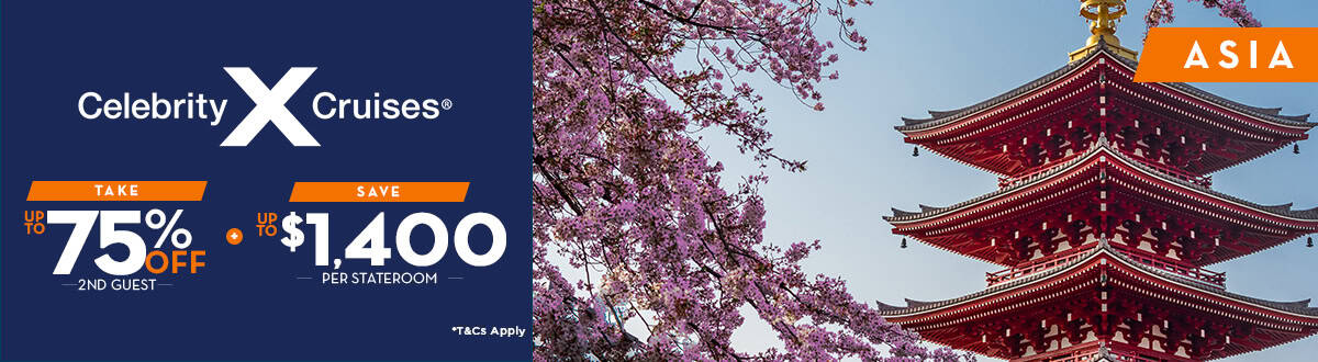 Up to $1400 Savings Offer applies to new, individual bookings at standard and prevailing or closed group standard or GroupX rates from 03/12/25 to 08/12/25 on an Offer Cruise, excluding Celebrity River cruise and Galapagos, and provides cruise fare savings per stateroom varying by stateroom category and length of voyage booked: 3 to 5 nights, savings of $200 AUD for inside and ocean view, $350 AUD for verandas, Concierge Class, AquaClass and $700 AUD for Suites; 6 nights or longer, savings of $350 AUD for inside and ocean view, $650 AUD for verandas, Concierge Class, AquaClass and $1400 AUD for Suites.