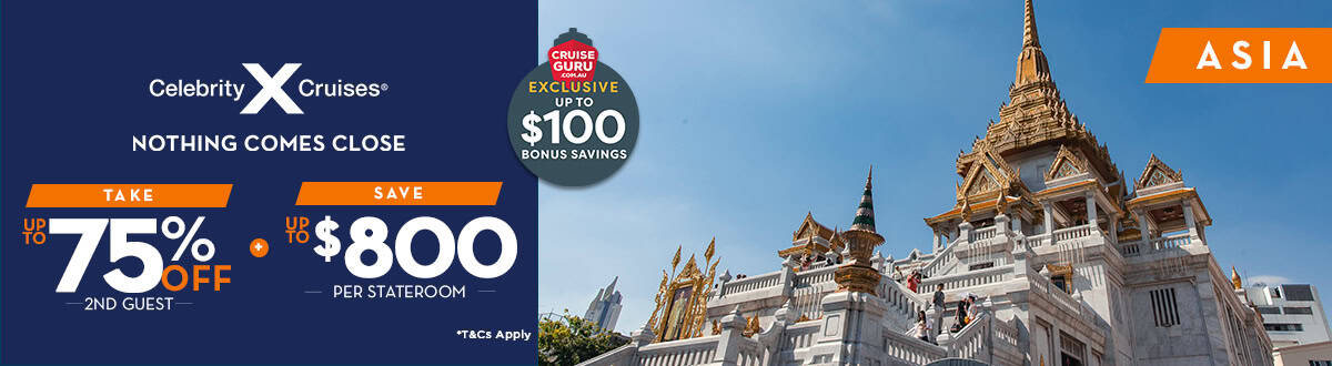Discount is exclusive to Cruise Guru and applicable to all international Celebrity Cruises sailings departing in 2025 and 2026. Discount reflects in category selection and final booking screen. Discounts are not combinable with Future Cruise Credits and valid for new bookings only. In the event that the cruise fare is complimentary for any specific passenger, the discount will not apply for that passenger and the total discount will therefore be reduced. We reserve the right to withdraw this promotion or alter it at any time.