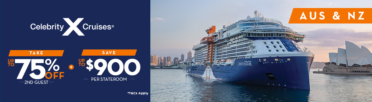 Up to $900 Savings Offer applies to new, individual bookings at standard and prevailing or closed group standard or GroupX rates from 07/11/25 to 12/11/25 on an Offer Cruise, excluding Celebrity River cruise and Galapagos, and provides cruise fare savings per stateroom varying by stateroom category and length of voyage booked: 3 to 5 nights, savings of $75 AUD for inside and ocean view, $150 AUD for verandas, Concierge Class, AquaClass®️ and $300 AUD for Suites; 6 nights or longer, savings of $225 AUD for inside and ocean view, $450 AUD for verandas, Concierge Class, AquaClass®️ and $900 AUD for Suites.