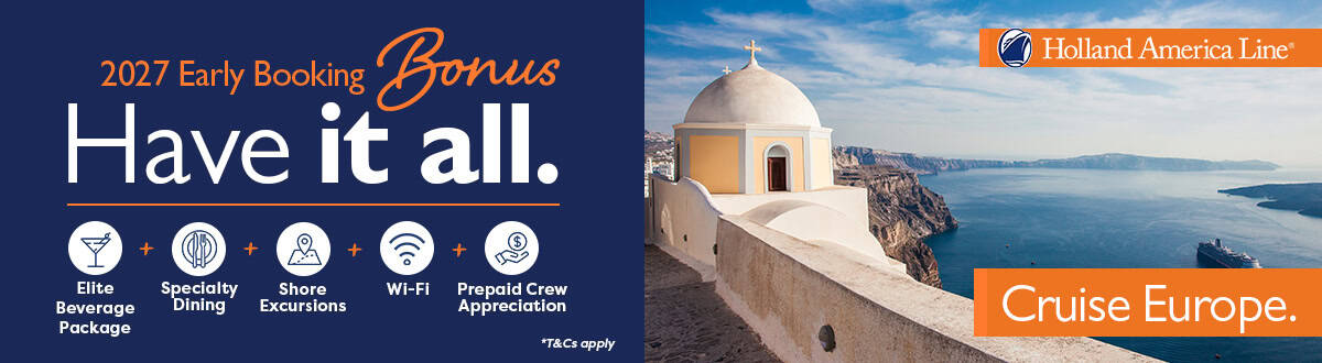 Holland America have released their 2027 Europe Cruises. Now is the time to book to secure your desired cabin. Plus, if you book now, you can also enjoy the benefits of the Have it All Early Booking Bonus: