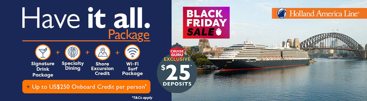 View cruises applicable to the Have It All Black Friday Sale deal below, or for more options view our main Holland America page, or use our Cruise Finder to search for your perfect Holland America cruise. Alternatively view other cruise deals.