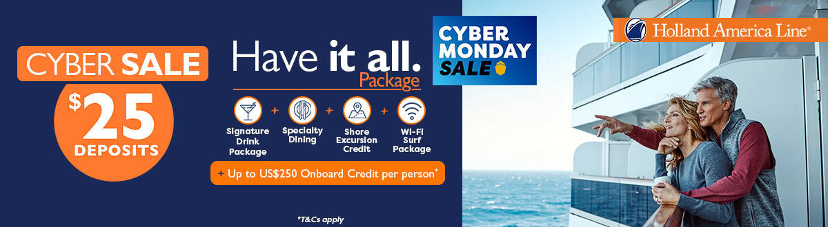 View cruises applicable to the Have It All Cyber Monday Sale deal below, or for more options view our main Holland America page, or use our Cruise Finder to search for your perfect Holland America cruise. Alternatively view other cruise deals.