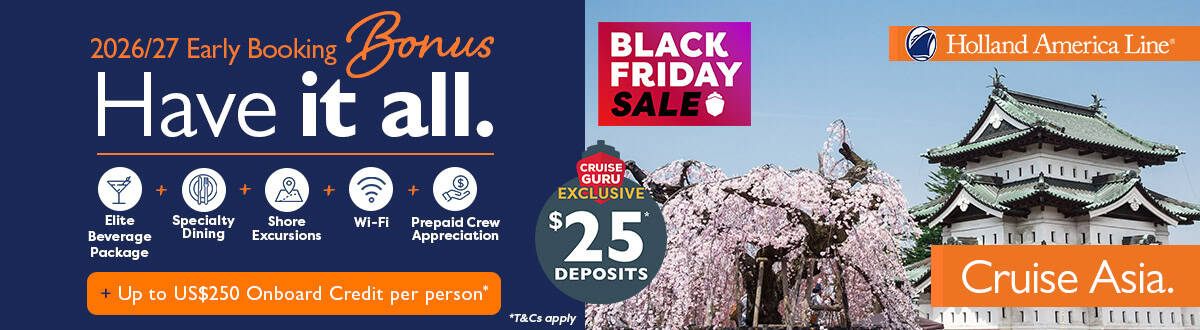 Cruise Guru Exclusive: $25 per person deposit for cruises departing after 28 April 2026.