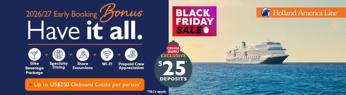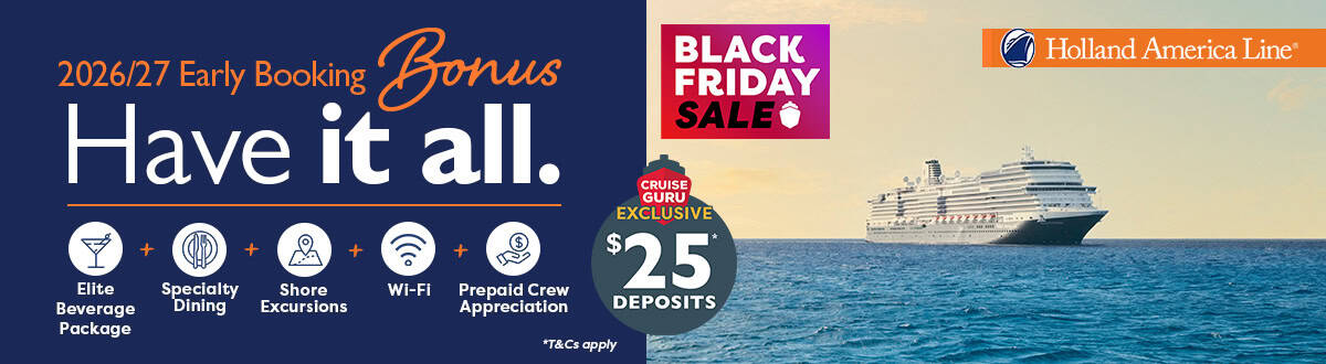 *Have It All Early Booking Bonus Offer (“Early Booking Bonus Offer”) is available for a limited time, on a first-come, first-served basis, to the first guests who make a new booking in connection with the Early Booking Bonus Offer available for cruises departing October 2026–May 2027 and ends on 11 December 2025. Taxes, Fees & Port Expenses are included. All values herein are in USD. Holland America Cruise Line (“HAL”) may change or revoke the Offer or its parts at any time. Early Booking Bonus Offer is valued at US$139 per day. Other exclusions and terms may apply; void where prohibited. Early Booking Bonus Offer and its parts are neither transferable, substitutable, nor redeemable for cash. Early Booking Bonus Offer is available for 1st/2nd guests only and applies only to the cruise portion of Alaska cruisetours. Early Booking Bonus Offer fares available only on select departures.