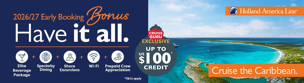 View cruises applicable to the Have It All Early Booking Bonus Sale deal below, or for more options view Have it All Early Booking Bonus local cruises, Have it All Early Booking Bonus cruises in Asia, Have it All Early Booking Bonus cruises in Europe, Have it All Early Booking Bonus cruises in Alaska, our main Holland America page, or use our Cruise Finder to search for your perfect Holland America cruise. Alternatively view other cruise deals.