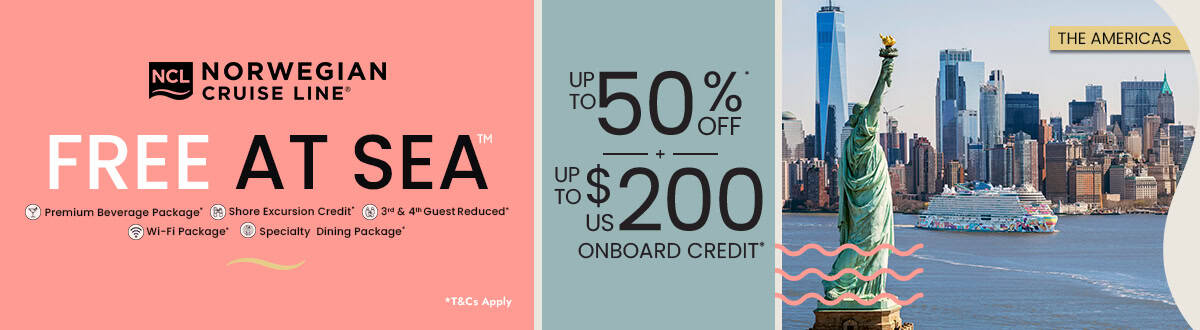 Save up to 50% + Up to US$200 Onboard Credit* PLUS up to FIVE included perks when you book on the SUPER SAVER or EARLY BOOKING SAVER FARE sale fares: