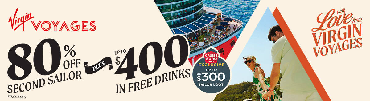 Wave 2026: 80% off Second Sailor + up to US$400 in Free Drinks offer. Qualified bookings will be eligible for a certain percentage off of the voyage fare for a second person traveling in company, plus a free “Bar Tab” per cabin, in varying amounts
