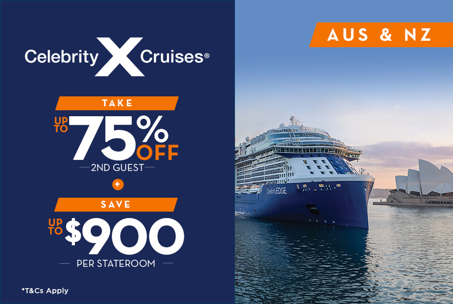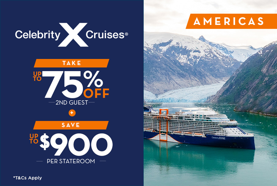 For a limited time on select local Celebrity cruises save up to 75% off 2nd Guest + up to US$900 off!