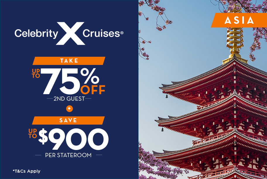 For a limited time on select Asia Celebrity cruises save up to 75% off 2nd Guest + up to US$900 off!